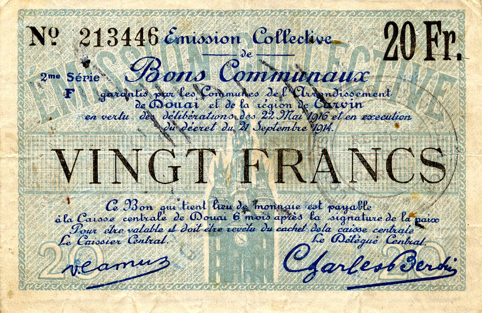Douai : guerre 1914 - 1918. Bon communal de vingt francs garanti par les communes de l'arrondissement de Douai et de la région de Carvin.